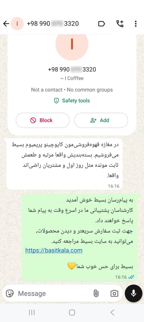 همکاری با کسبوکارهای مختلف (پوشش جامع بازار): ما در بسیط، خود را صرفاً یک تأمینکننده و تولیدکننده نمیدانیم؛ بلکه شریک تجاری شما در زمینه تأمین انواع نوشیدنی از جمله قهوه، چای و پودر آماده کاپوچینو هستیم. تنوع محصولات کاپوچینو عمده ما، پاسخگوی نیازهای تخصصی هر حوزهای است. ما بهطور مستمر، نیازهای کافهها و فروشگاههای عمومی (با محصولات پرفروش)، باشگاههای ورزشی و کلینیکها (با محصولات رژیمی)، هتلها، کافههای لوکس و هایپرمارکتها (با محصولات پریمیوم) و همچنین محیطهای اداری، دانشگاهها و عمدهفروشان بزرگ و ... را در حجم بالا تأمین میکنیم. برای خرید عمده قهوه از بسیط ، همین حالا با شمارههای درجشده در سایت تماس بگیرید. کارشناسان ما آمادهاند تا بهترین نوع این نوشیدنی را متناسب با زمینه کاریتان به شما معرفی کنند.