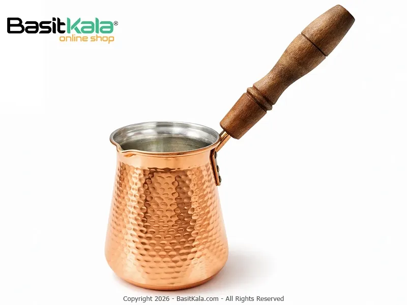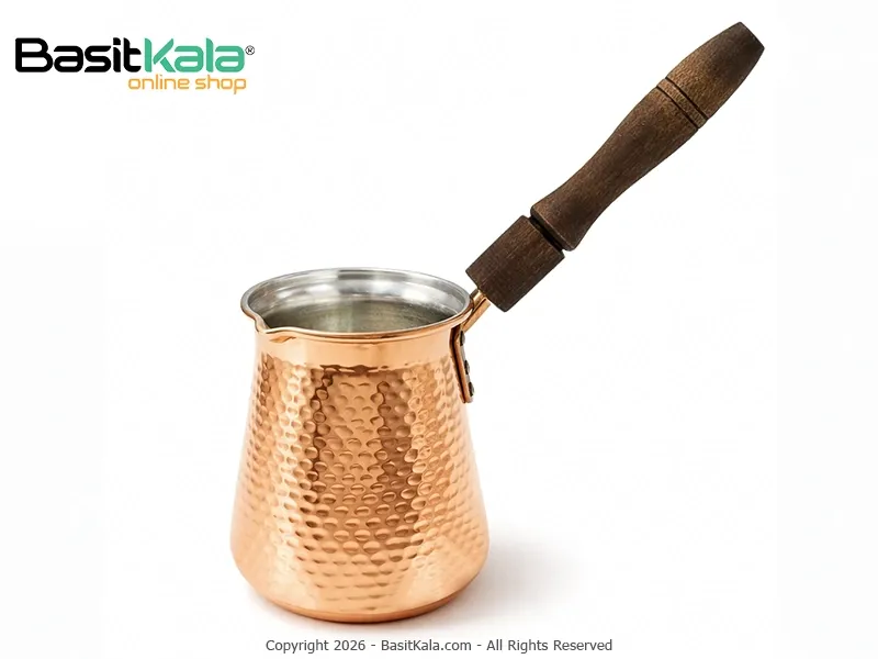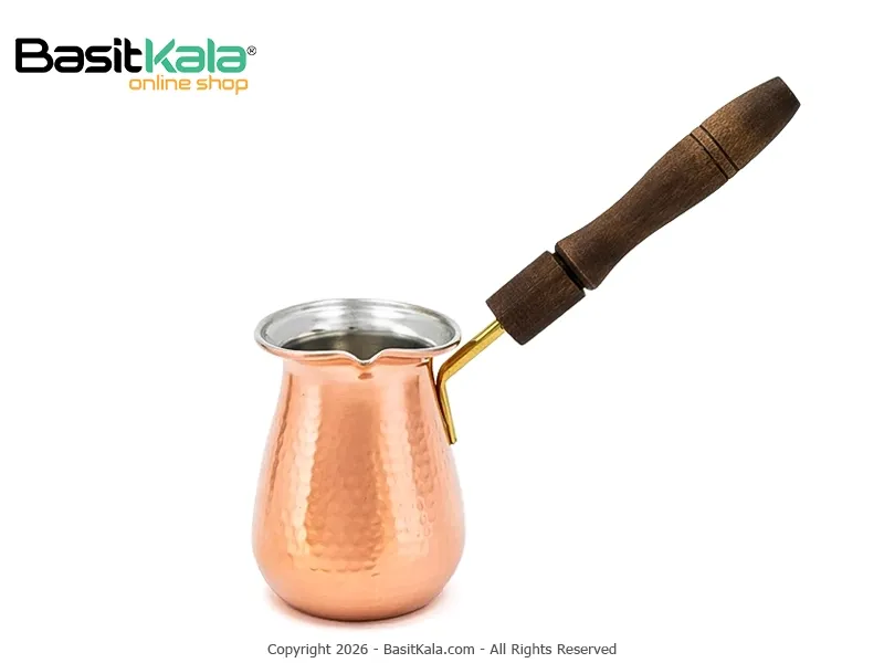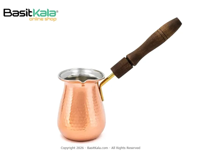 جذوه مسی با بدنه چکش کاری شده و دسته چوبی مقاوم؛ انتخابی مطمئن برای دمآوری قهوه ترک با حرارت یکنواخت، کف مناسب و طعم اصیل