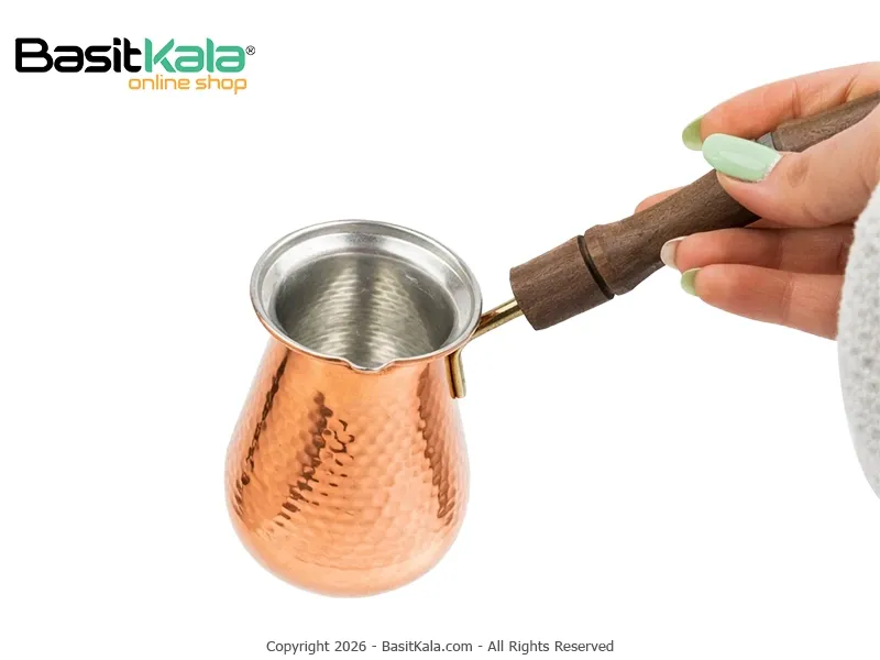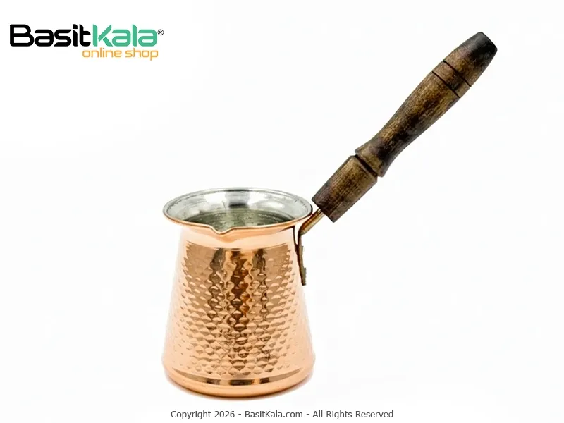 جنس و کیفیت ساخت: دارای بدنه مسی چکش کاری شده و مقاوم؛ دسته چوبی بادوام و خوشدست برای ایمنی و راحتی بیشتر
