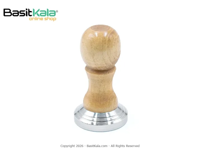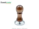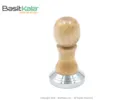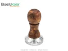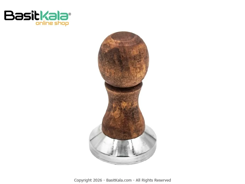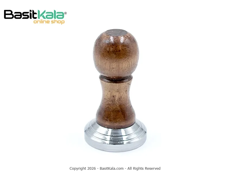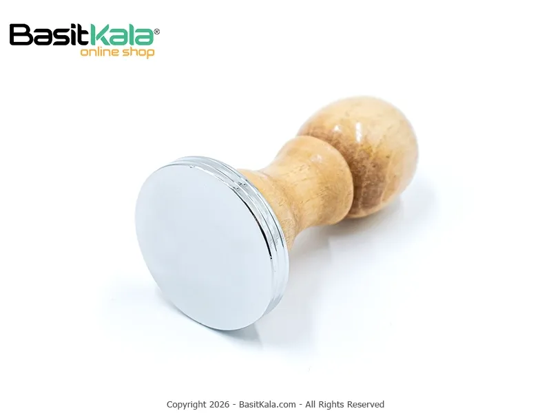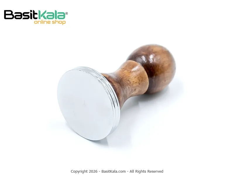 تمپر قهوه دسته چوبی با کف فلت بیس و پایه استیل؛ ابزاری برای فشردهسازی یکدست و دقیق قهوه برای عصارهگیری حرفهای؛ مناسب برای پرتافیلترهای 51 میلیمتری