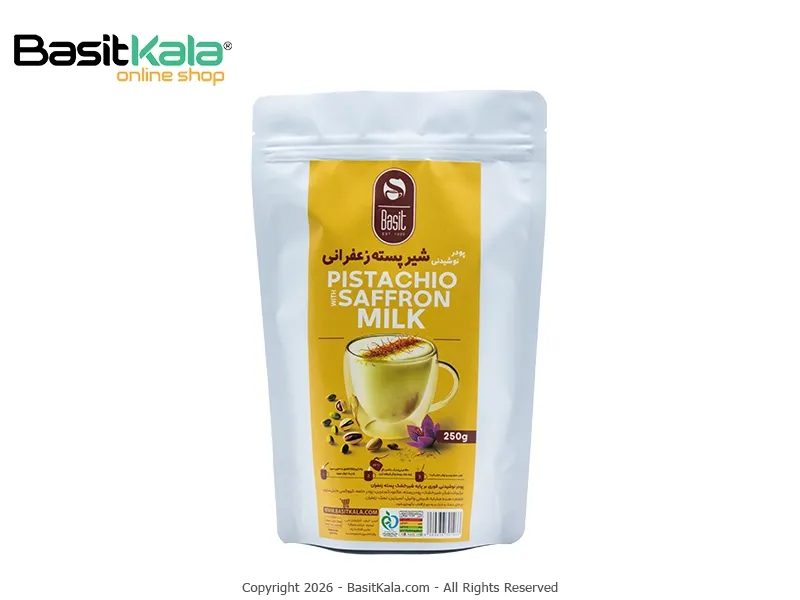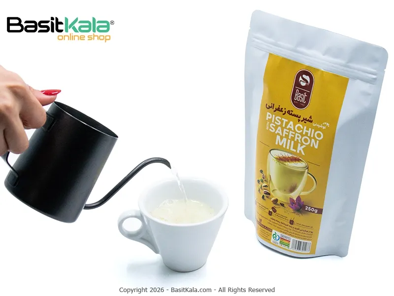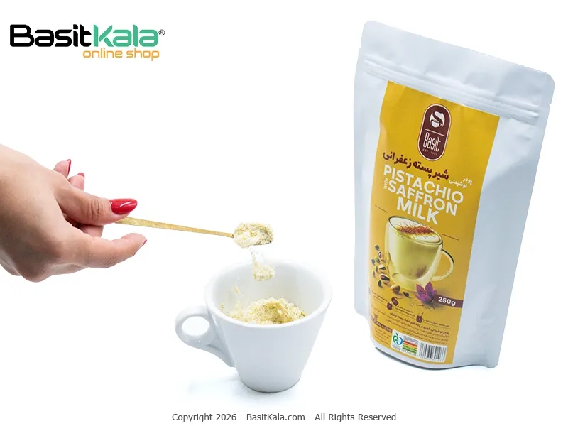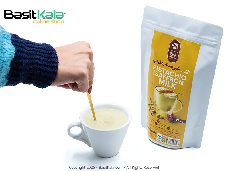 پودر شکلات سفید پسته زعفرانی بسیط؛ یک نوشیدنی گرم، خامهای، سالم و غنی با ترکیب پسته تازه و آسیاب شده و زعفران اصیل ایرانی