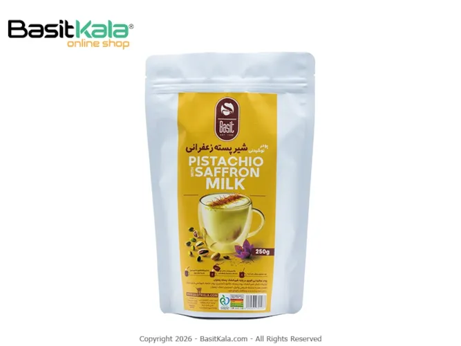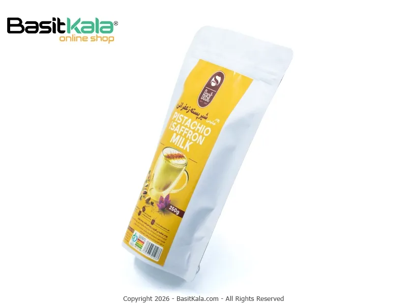 ترکیبات: شکر، شیر خشک، زعفران، پودر پسته درجه یک، پودر خامهایکننده و سایر ترکیبات مجاز