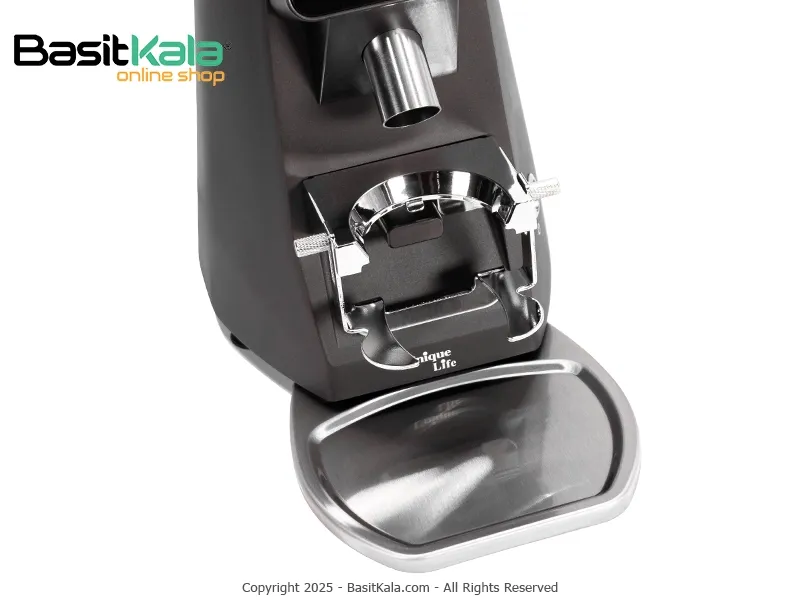 سینی فلزی مخصوص جمعآوری پودر قهوه در زیر خروجی آسیاب؛ جلوگیری از ریزش و آلودگی سطح میز