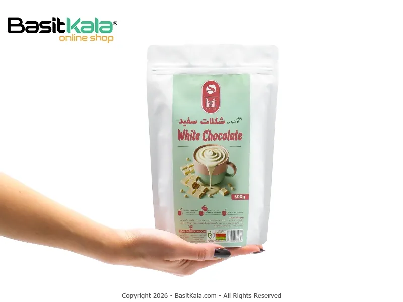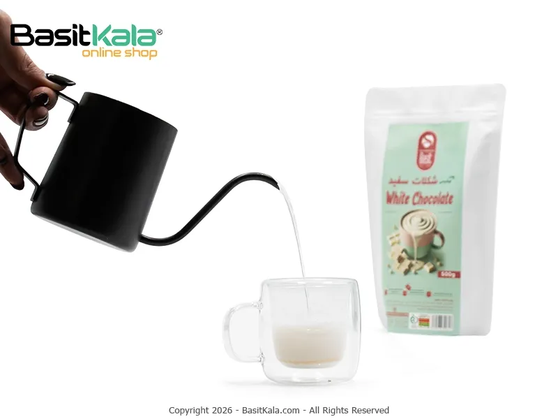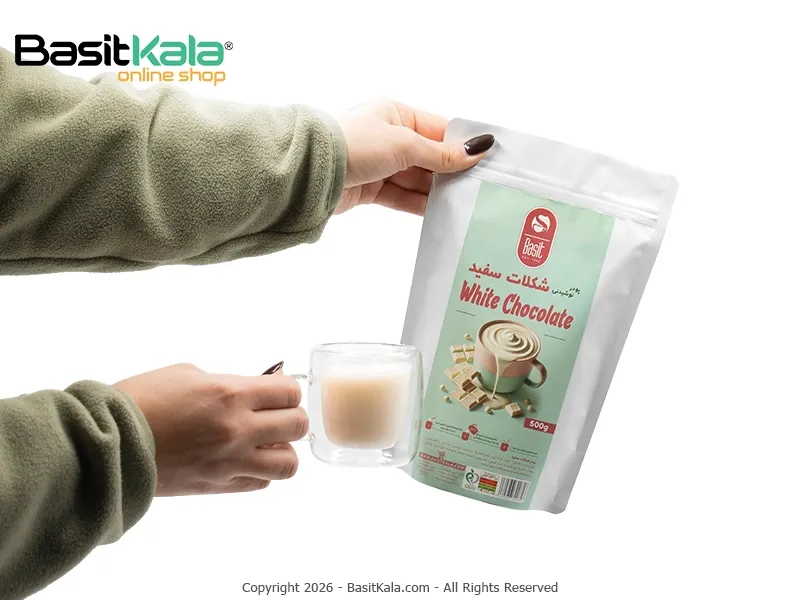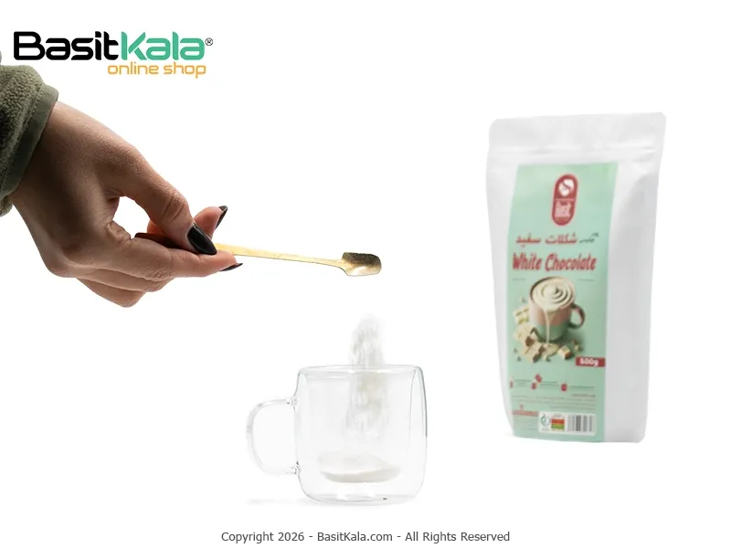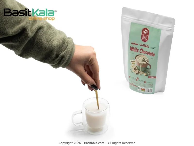 روش آمادهسازی: دو و نیم قاشق غذاخوری (حدود 25 گرم) از پودر وایت چاکلت را در 150 میلیلیتر آب یا شیر داغ حل کرده و هم بزنید تا بافتی خامهای پیدا کند.