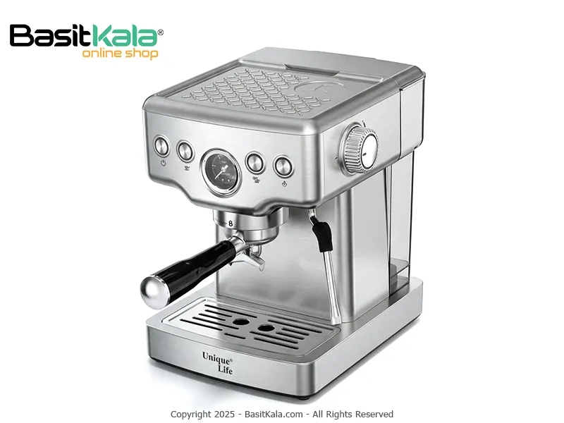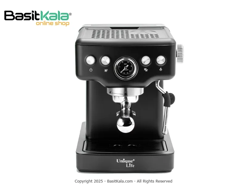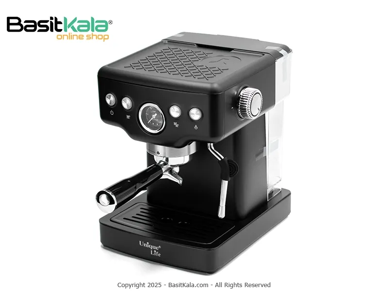 اسپرسوساز یونیک لایف مدل UL-8931؛ دستگاهی نیمهاتوماتیک و قدرتمند با فشار بالا (19 بار) در دو رنگ مشکی و استیل؛ برای تهیه اسپرسوی غلیظ با کرمای زیاد و تهیه نوشیدنیهای شیری در خانه و محل کار
