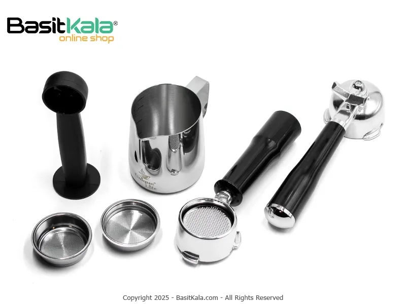 اقلام همراه: پرتافیلتر (Filter Holder)، فیلتر تک فنجان، فیلتر دو فنجان، قاشق اندازهگیری با تمپر، مخزن، سینی چکهگیر و متعلقات استاندارد دستگاه