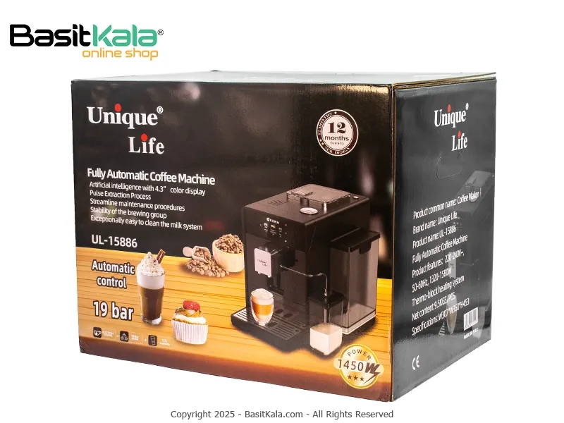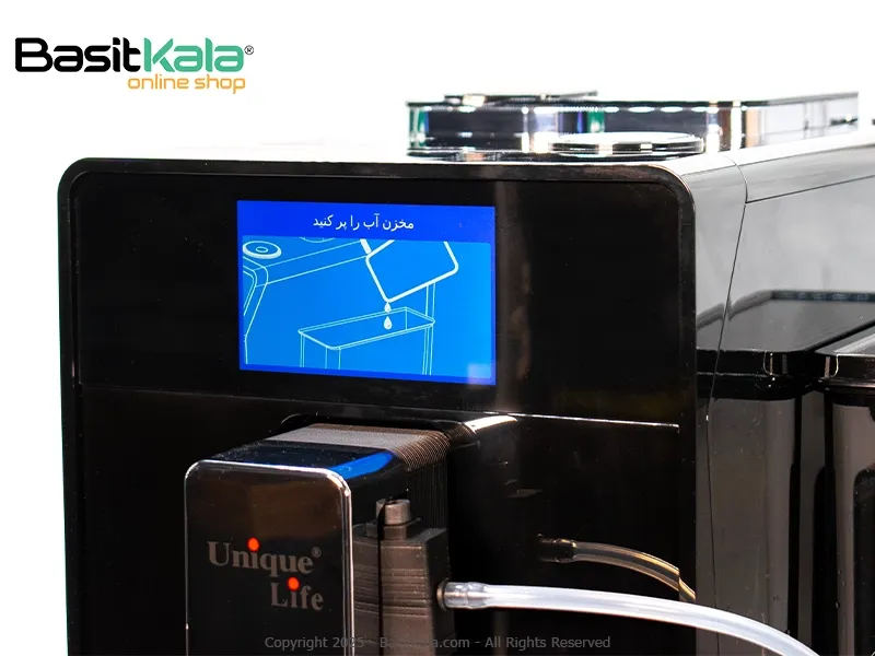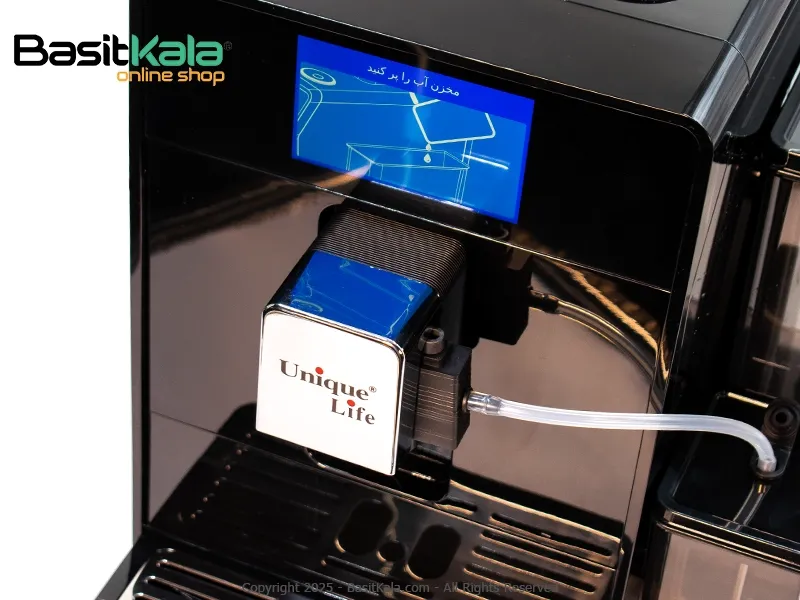 دستگاه قهوه‌ساز تمام‌اتوماتیک مدل UL-15886 یونیک لایف با صفحه‌ نمایش رنگی و آسیاب داخلی، انجام خودکار تمام مراحل تهیه قهوه از آسیاب گرفته تا عصاره‌گیری؛ قابلیت تهیه سریع و آسان انواع قهوه با کیفیت عالی (تنها با لمس یک دکمه)