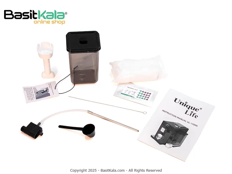 اقلام همراه: فرچه مخصوص تمیزکردن دستگاه، نوار تست درجه سختی آب، شیلنگ مخصوص اتصال مخزن شیر به دستگاه، اسکوپ قهوه پلاستیکی، ابزار پلاستیکی شستشوی سیستم شیر و دارای پودر رسوب زدا