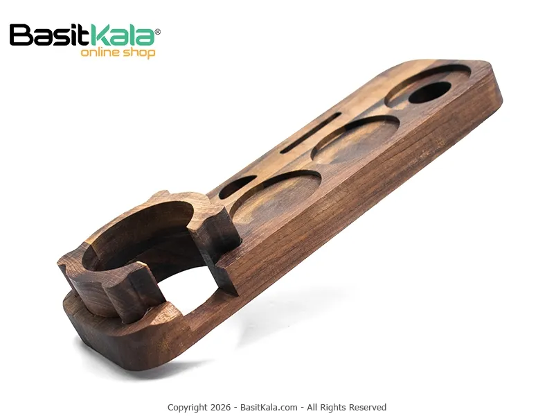 استند چوبی پرتافیلتر و لوازم بار گرم ۵۸ میلیمتری، ابزاری شیک و خوش ساخت برای نظم دهی به میز باریستا با 6 جایگاه مجزا جهت دسترسی سریع به ابزارهای ضروری تهیه اسپرسو
