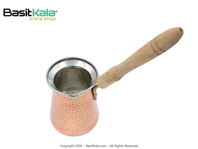جنس و کیفیت ساخت: ساخته شده با بدنه مسی چکشکاری شده برای انتقال یکنواخت حرارت و دسته چوبی جهت کنترل بهتر و ایمنی بیشتر هنگام دمآوری